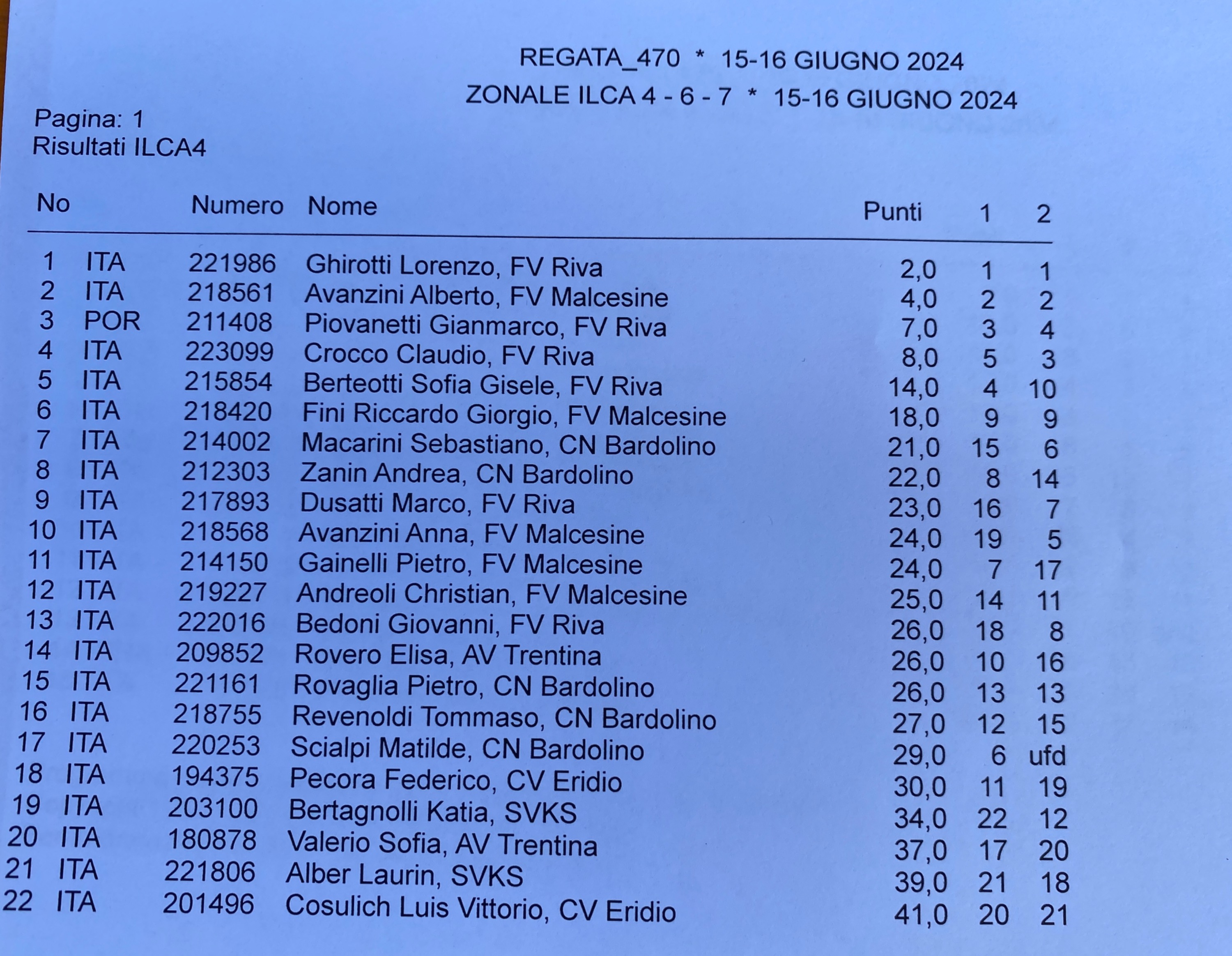 Nella classe 470, con 4 punti, padre Guido Fellin con il figlio Daniele (Associazione Vela Lago di Caldaro) ha prevalso su Francesco Valla/Pietro Calzavara (Jesolo YC), 7 punti, e Matteo Pettenello/Marco Penzo (LNI Belluno), 8 punti. Fellin/Fellin si sono anche laureati campioni sociali. Nella classe ILCA, ha trionfato la Fraglia Vela Riva: nell’ILCA 4 Lorenzo Ghirotti (FV Riva) ha vinto con 2 punti davanti ad Alberto Avanzini (FV Malcesine/4 punti) e Gianmarco Piovanetti (FV Riva/7 punti). Nell’ILCA 6 c’è stato un triplo successo della Fraglia Vela Riva: Mattia Di Lorenzo (6 punti) ha vinto davanti a Federico Bonalana (10 punti) e Leonardo Malfer (11 punti). Campionessa sociale è diventata Katia Bertagnolli davanti a Laurin Alber nell’ILCA 4, mentre Daniele Formaggio ha prevalso su Walter Menghin e Simone Bonapace nell’ILCA 6.